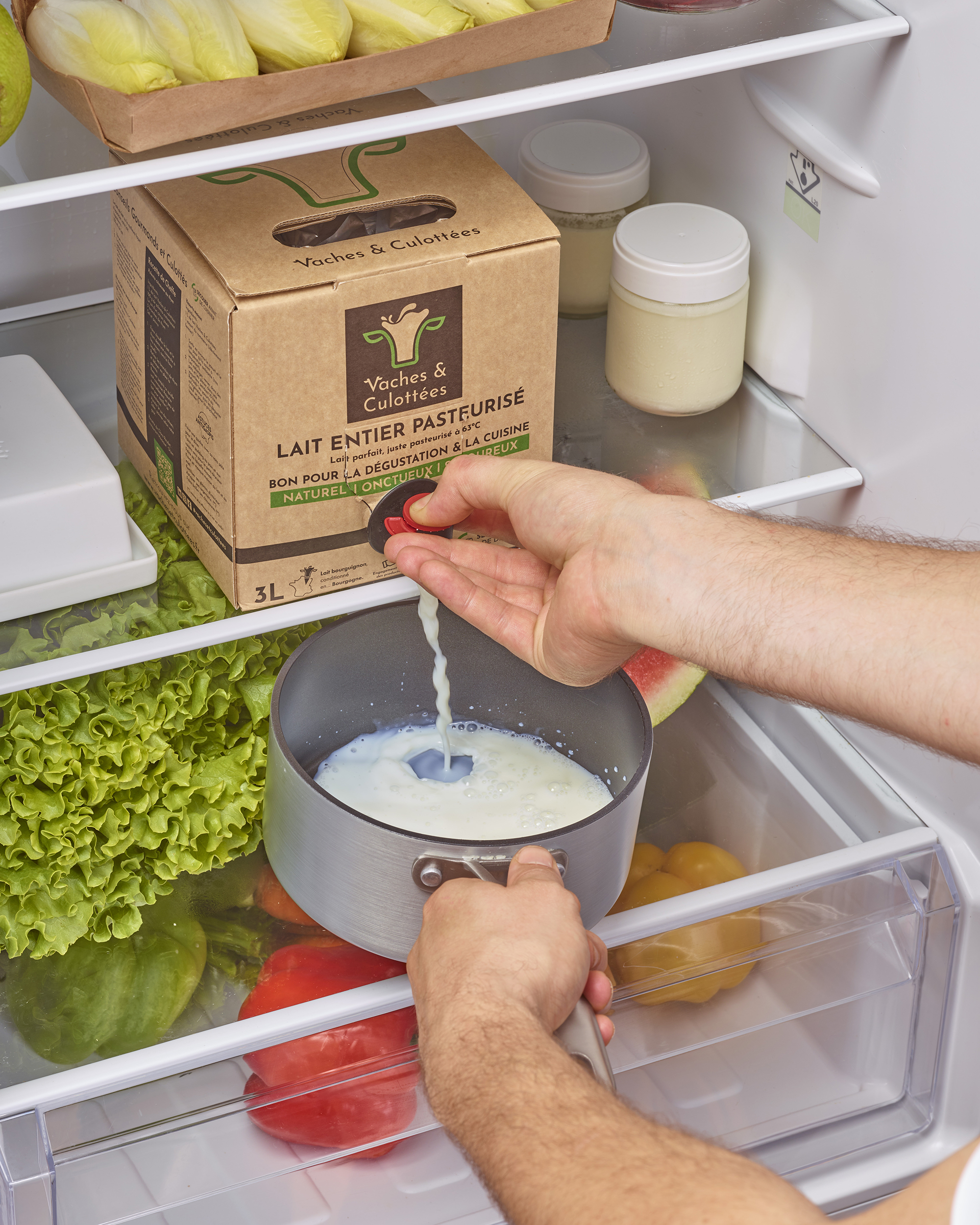 Grâce à sa forme cubique, il s’intègre parfaitement dans les réfrigérateurs, et son robinet spécifique permet une meilleure conservation du lait. Soucieuses des enjeux écologiques actuels, Dominique et Stéphanie sont engagées dans une démarche d’amélioration continue de ce packaging.