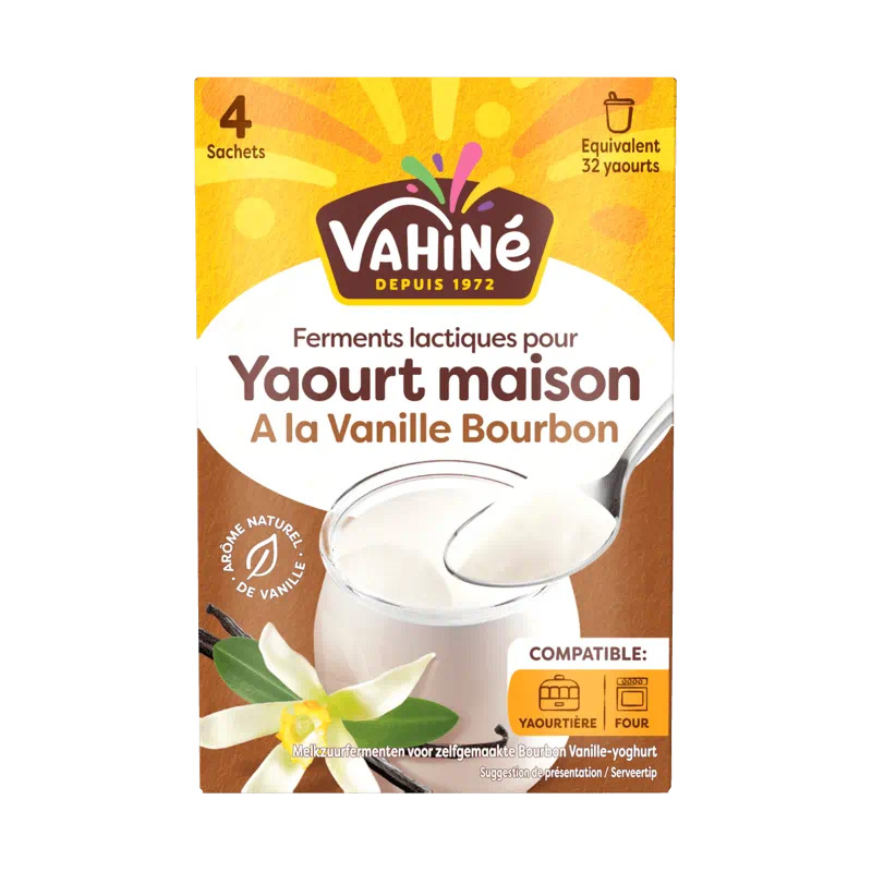 Les ferments Vahiné combinent des ferments lactiques et des arômes naturels de Vanille Bourbon et de Citron, rendant la préparation des yaourts maison ultra simple. Que vous utilisiez une yaourtière ou votre four, vous obtiendrez des yaourts gourmands et savoureux.