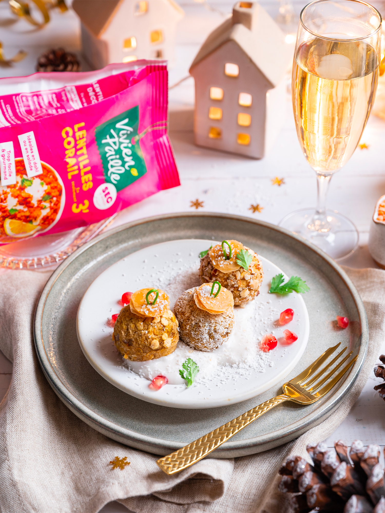 Vivien Paille détourne la traditionnelle bouchée festive en version végétale et malicieuse avec des « boules de Noël » à base de lentilles corail.